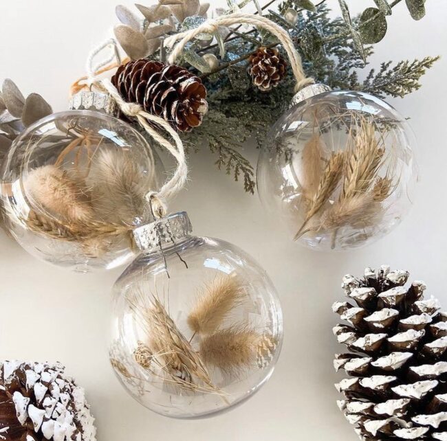 Natural elegance is all about blending organic materials with touch of sophistication. Clear glass ornaments filled with dried grasses and delicate botanicals offer an enchanting visual appeal, perfect for any season.