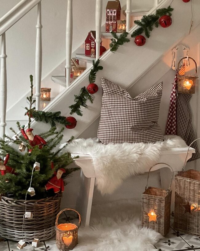 The staircase adorned with garlands and whimsical ornaments creates visual interest, guiding the eye through this festive space. Twinkling lights cast gentle glow, enhancing the atmosphere of joy and togetherness.