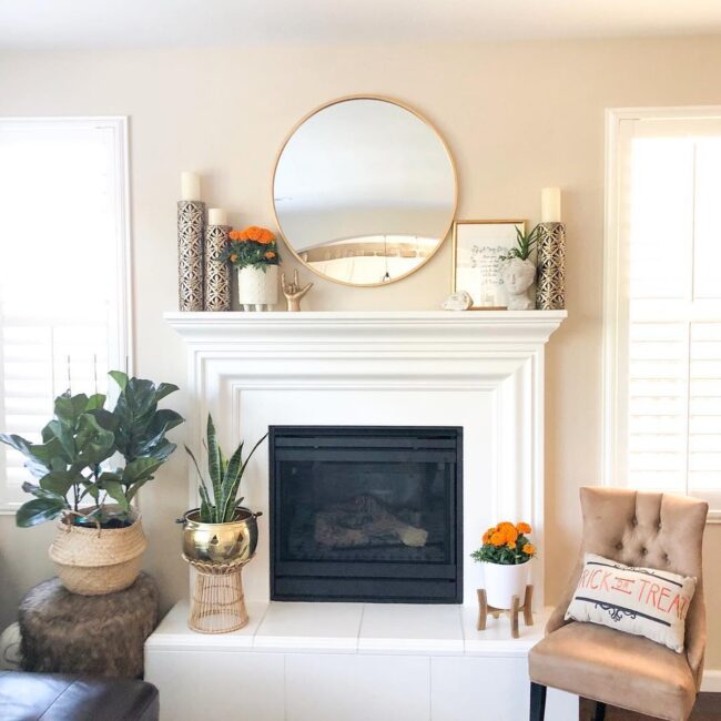 Elegant marble mantel with autumn accents brings sophistication and warmth to your Halloween decor.