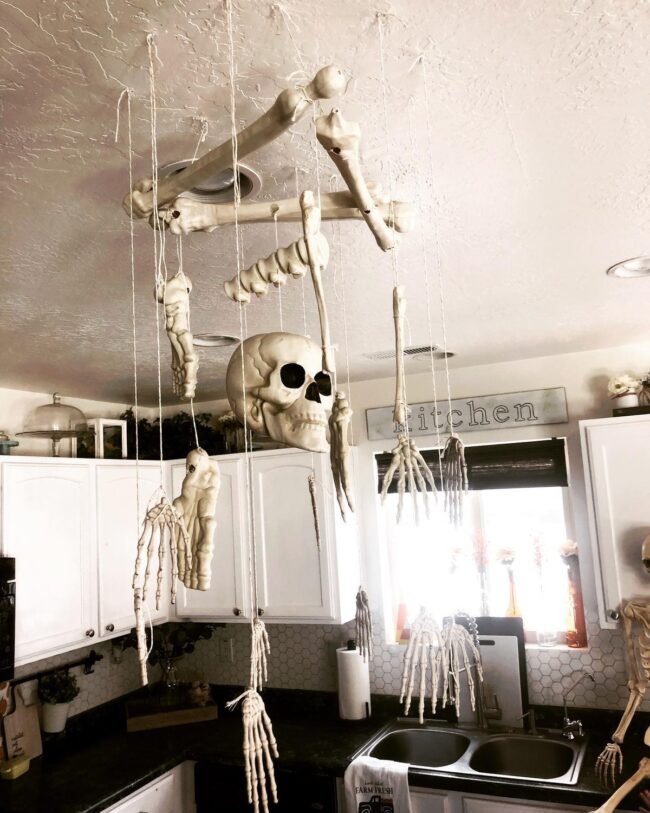 Skeleton mobile decor for the kitchen creates a macabre yet intriguing display.